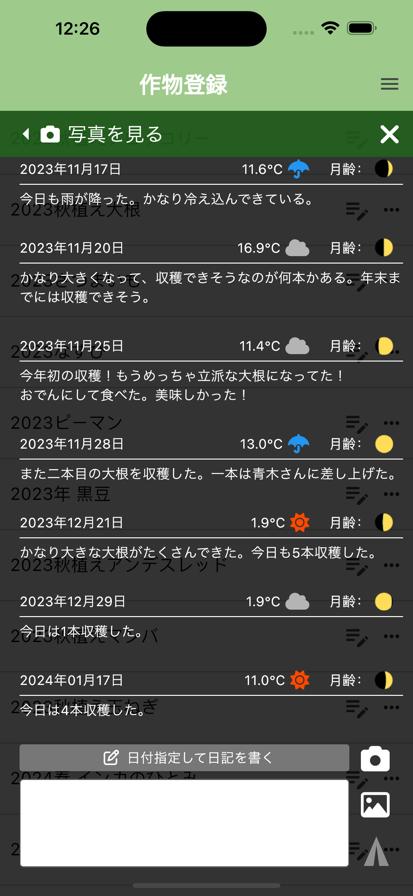 いつ、どこに、何を、どれだけ植えたのかすぐにわかる畑・家庭菜園の管理アプリです。 過去の状態を平面図として残せるので、連作防止の確認に使ったり、これから植える作物の場所を考えたりするのに使えます。 写真とテキストで日々の栽培記録をつけ、あなたの農ライフをより充実したものにしてください。 ・畑画面に自由に畝や作物を配置して、あなたの畑のどこに何が植えられているのか一目でわかります。 ・植えた作物にはアイコンを設定できます。 ・栽培日記をつけることができます。 ・やることリストを登録してリマインダー通知することができます。 ・収穫量を記録することができます。 ・一年間いつからいつまで何を植えたのかを一目で確認できます。 ・アプリからカメラを起動して、写真を素早く撮ることができます。 ・iPadやiPhoneの画像ギャラリーから写真をアップロードすることもできます。 ・作物ごとに記録をつけることができ、写真も作物ごとに管理できます。 ・チャット画面のような記録画面で、過去の記録も追いやすくなっています。 ・作物ごとに種の費用や肥料の費用などを記録しておくことができます。 ・天気、気温、月齢が自動的に記録されます。 ・カレンダーから日付を選ぶと、その日の畑の様子を確認できます。 ・ギャラリー画面で全ての写真を見ることもできます。 画面を広く使えるため、iPadでの使用を推奨しています。 - 利用規約 - https://www.apple.com/legal/internet-services/itunes/dev/stdeula/