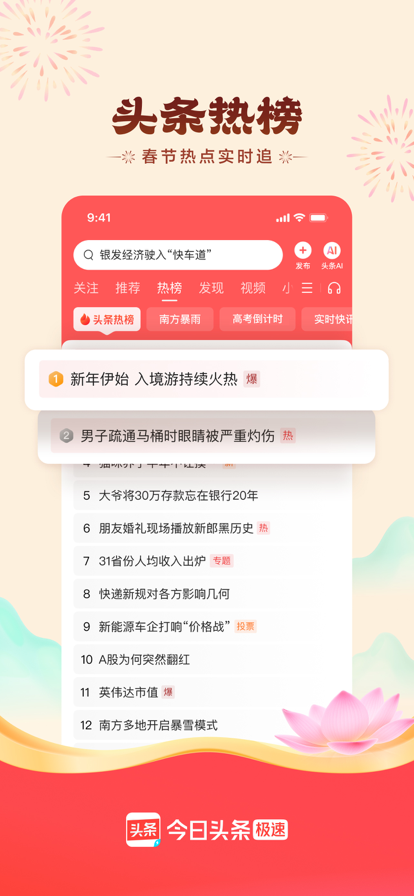 今日头条,懂你的信息平台 官方推荐精品应用 近亿网友与你一起在头条! 热点资讯应有尽有 — 智能算法推荐你感兴趣的信息、无数明星大V在这里跟你互动; 人人都是原创作者 — 发布自己的微头条、与千万网友在问答区参与热点讨论; 发现生活记录生活 — 有全网精彩无广告短视频,也有草根生活喊麦达人原创小视频; 专属领域满足个性 — 分类连载小说漫画超快更新,足球美妆全部覆盖; 今日头条,一款越用越懂你的资讯客户端 基于机器学习的个性化资讯推荐引擎,5 秒算出你的兴趣,每日 1000 多位工程师精心优化算法,只为每一次推荐都更加精准,让阅读更加有用高效。 【发布专属微头条】 上传发布原创内容,你也可以上头条! 超多明星大V入驻,关注一手动态,与偶像互动升级 【新鲜短视频看不停】 影视搞笑娱乐游戏生活...覆盖全网千万精彩短视频 无广告省流量,无论热点冷门一键看过瘾 【丰富频道 你要的都在这里】 海量小说随心畅读,超清漫画漫迷社区 一手体育新闻 热辣赛事点评 【火爆问答区】 为你推荐更精确的内容,参与优质内容创作,讨论热点话题 “所有人问所有人,所有人答所有人” 【个性化内容支持收藏】 80万+头条号网罗所有精彩资讯,有内容有观点有时效 心仪内容一键收藏,历史记录搜索无压力 ====== 来自用户的好评 ====== @爱因斯煎蛋:“每天超多短视频可以看,在地铁上看新闻和视频都不用花流量简直太棒!推荐给了爸妈和朋友,他们天天在上面看汽车、食谱类的内容,直接看推荐,跟我一样变成了忠实用户。” @gaodazhizi:“终于可以发自己的头条内容了,这就是我选择头条不用其它客户端的原因。跟同学们加了关注,我的新闻也可以上他们的头条了!” @鸣杨:“本来作为漫迷 有时候看看漫画 追追小说,结果居然在视频频道还发现了美妆教学,现在追着短视频看,还把男朋友拉进来他看球赛和直播,我看短视频。继续加油” @月月楠妹:“我喜欢的明星竟然都入驻了,赵又廷 baby 林宥嘉..天啊,在头条里还可以看到他们的动态,给他们留言等,头条已经变成我心里最好用的资讯App啦~ ” @联系头条 -软件反馈:我的-用户反馈 -客服反馈:kefu@toutiao.com -今日头条官网:toutiao.com -头条号自媒体平台:mp.toutiao.com -官方合作:BD@toutiao.com -头条招聘:HR@toutiao.com