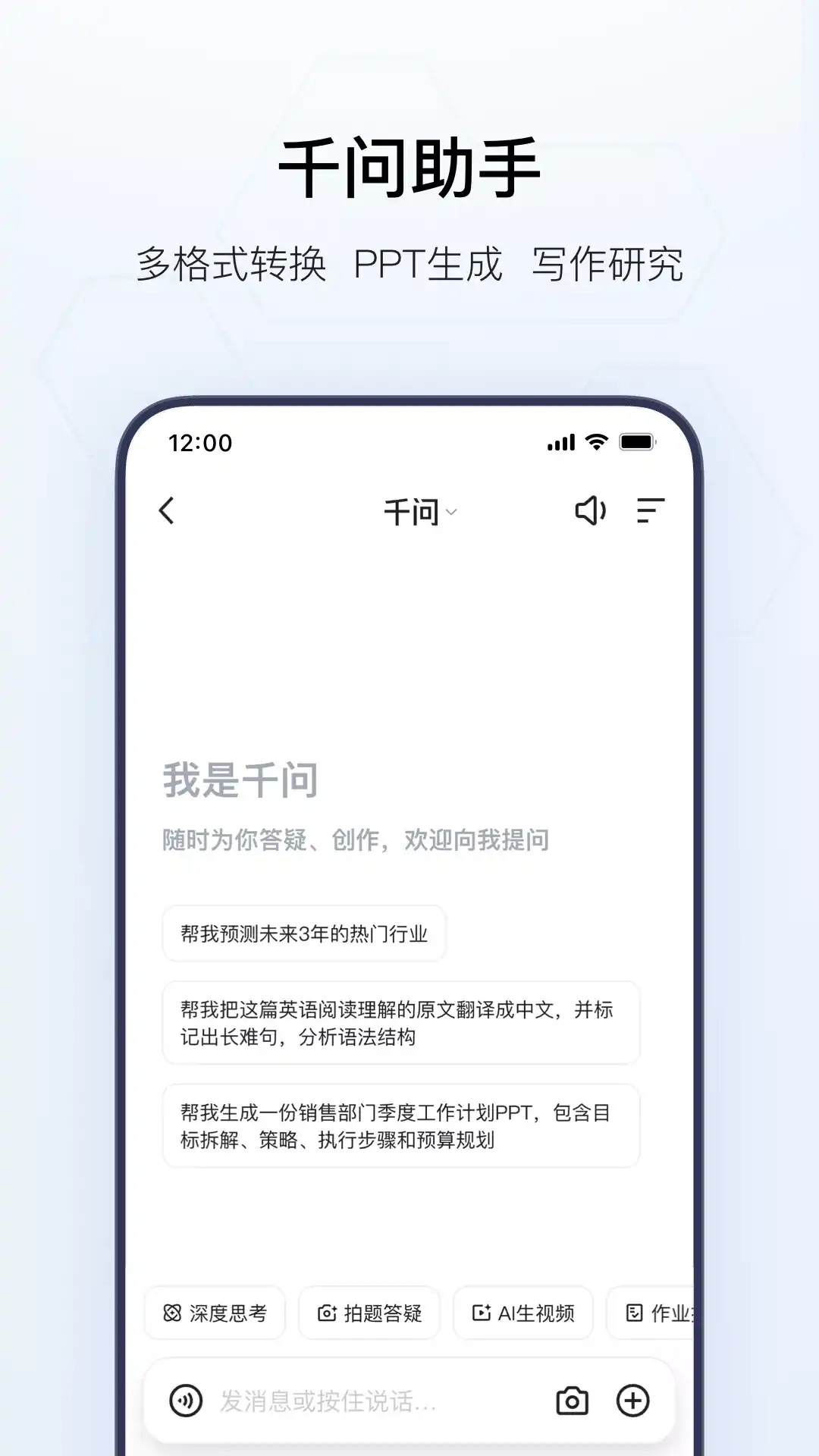 夸克是AI旗舰应用,使用阿里最强Qwen大模型,推理、理解、执行能力强大。 夸克提供搜索、助手与云端服务,无论你在学习、办公、创作或生活中遇到什么问题,夸克都能即时响应、深入分析,并给出清晰、专业的解决方案,为你带来高效、全面、可信赖的 AI 体验。 【千问助手】 AI助手,使用Qwen新模型,为你提供专业、高效的高质量解答。它基于优质知识源与强大的推理能力,在复杂场景下也能输出权威、准确的答案。 先进模型:多模型可选,既适合日常问答写作,也适合科研级推理、公式计算等复杂的多步骤决策场景。 深度搜索:具备强大的推理与执行能力,擅长处理复杂逻辑与多步骤决策。 文采出众:从公文、论文到社交媒体文案,支持全体裁、多场景写作。多种文风,用语得体。 表达清晰:回复结构化呈现,含图表与分点描述,复杂信息一目了然。 多模理解:文字、语音、拍照都能对话,还可以上传文档、提炼要点、转换格式。 【AI搜索】 高效检索: 查资料、看资讯、找答案,夸克帮你快速找到最合适的结果。 智能理解: 搜索更懂你,自动理解意图,答案更贴近问题。 AI 总结: 即时生成摘要,汇总重点信息,让复杂问题一眼看懂。 结果优化: 搜索结果更直观、更智能,节省时间更省心。 纯净体验: 界面简洁无广告,信息更纯净,让搜索回归本质。 【AI生产力工具】 AI写作:全体裁写作,写方案、报告、文案,都能一句话生成,逻辑流畅自然。 拍题批改:拍题答疑,难题讲解详实准确,学习效率倍增。 夸克PPT:输入主题即可生成专业演示文档,自动排版与结构优化。 夸克扫描王:拍照识别文字与表格,自动提取、整理、总结。 夸克翻译:多语言即时互译与语义理解,阅读外文网页更顺畅。 【夸克小说】 海量书库: 百万级正版藏书,都市爽文、言情穿越、悬疑探案、玄幻修仙,应有尽有。 极致阅读: 排版清爽、操作便捷,沉浸阅读更舒适。 AI 听书: 多音色自然朗读,声音流畅真实,沉浸体验更生动。 【夸克网盘】 超大空间:6T超大空间,照片、文件安心存储。 多端同步:手机电脑随时看。 超级播放器:高清画质、AI字幕,沉浸式观影体验。 如果你在使用产品过程中遇到了任何问题或需要我们协助,请通过以下方式联系我们,我们将尽快处理! 反馈方式: -软件反馈:设置->意见反馈 -邮件反馈:kksupport@service.alibaba.com -官方网站:http://www.quark.cn