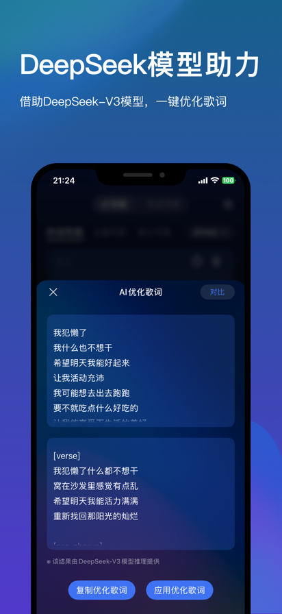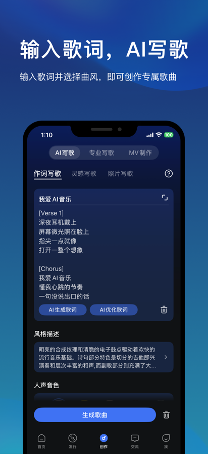 快来和灵动AI一起探索音乐创作的未来吧——灵动AI是人工智能与音乐艺术的结合,它让任何人都能成为音乐制作人。无论你是音乐新手、初学者、进阶爱好者、音乐制作人还是专业音乐人,灵动AI都能轻松将你的音乐梦想变为现实! 创新性的生成式AI音乐: -灵动AI采用了一种革命性的AI技术,能深刻理解音乐风格、乐器特性及人声表现。仅需1-2分钟,它便能依据您描述的内容和想法,创作出一首完整的歌曲,包括精准匹配的歌词与高度真实的声音。 -你不需要精通音乐理论或擅长乐器演奏。只要您拥有创意,灵动AI能帮助你把想法转化为音乐。每个人都有机会创作音乐,让我们共同构建一个充满创新与音乐艺术的世界。 产品特点: 【快速创作音乐】仅需简单描述您的音乐愿景,灵动AI即刻从作词、作曲到演唱,完美实现您的音乐梦想,让创作音乐变成一种享受。 【音乐风格多样】无论你喜欢哪种音乐风格,灵动AI都能轻松驾驭,并且能将各种音乐风格进行结合和探索,让音乐更具有想象力。(民谣、摇滚、电子音乐、RAP、POP、爵士、乐队、经典流行、R&B、国风、FUNK、世界音乐等数百种音乐风格) 【真实乐器人声】灵动AI可模拟出的非常真实的乐器音色和人声,可媲美高级录音室的完美音质和调音,带给你无与伦比的听觉享受。 【多级创作模式】无论是音乐初学者还是资深制作人,灵动AI均提供了量身定制的创作模式,确保每一位音乐爱好者都能找到最适合自己的创作方式。 【轻音乐制作人】除了出色的人声歌曲创作能力,灵动AI擅长打造高品质的轻音乐,满足你多样化的音乐创作需求。 【简洁易用界面】在底层是复杂逻辑的人工智能算法下,灵动AI也以直观简便的界面呈现,让每位用户都能轻松上手,畅享音乐创作真正的乐趣。 灵动AI,你的全能音乐创作伙伴,集成了AI创作、AI写歌、AI编曲、AI作词、AI轻音乐的写歌神器,无论是音律探索、歌词创作、原创音乐制作,还是节奏调整、声音合成、嘻哈押韵、乐器演奏等,都能一气呵成。无论您是音乐新手还是经验丰富的制作人,灵动AI都能帮助您轻松跨越创作障碍,激发无限灵感,让每一次音乐之旅都充满惊喜与可能。立即加入我们,开启你的音乐创想新时代! 隐私政策:https://kdocs.cn/l/ctLOWfbaZ3tr 用户协议:https://kdocs.cn/l/crm1dpocrAHR