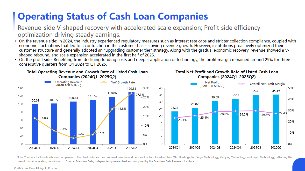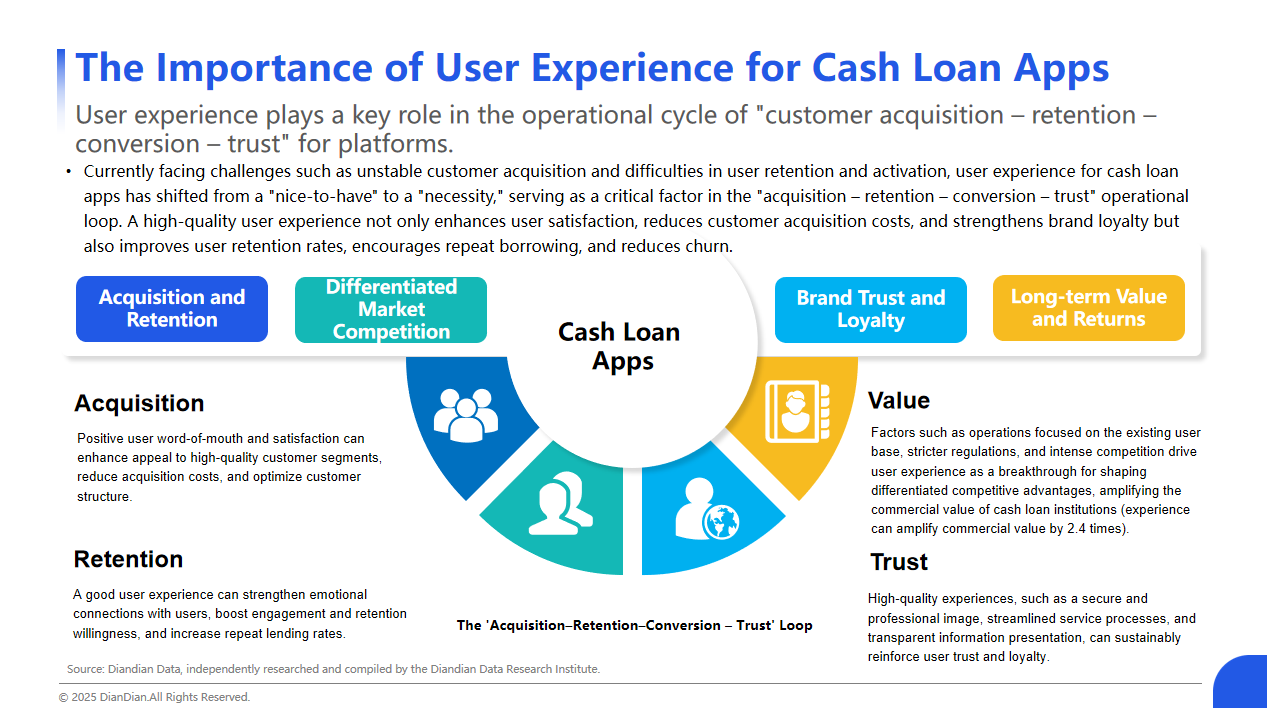 Cash lending enterprises are experiencing a V-shaped recovery on the income side, with accelerated expansion of scale and optimized efficiency on the profit side, driving stable returns; The market space is good, with a phased increase in scale and seasonal dependence characteristics. The market is shifting from incremental driving to stock operation, and user retention can be enhanced through scenario extension and experience optimization; User experience can play a key role in the "customer acquisition retention conversion trust" business cycle of cash lending institutions;